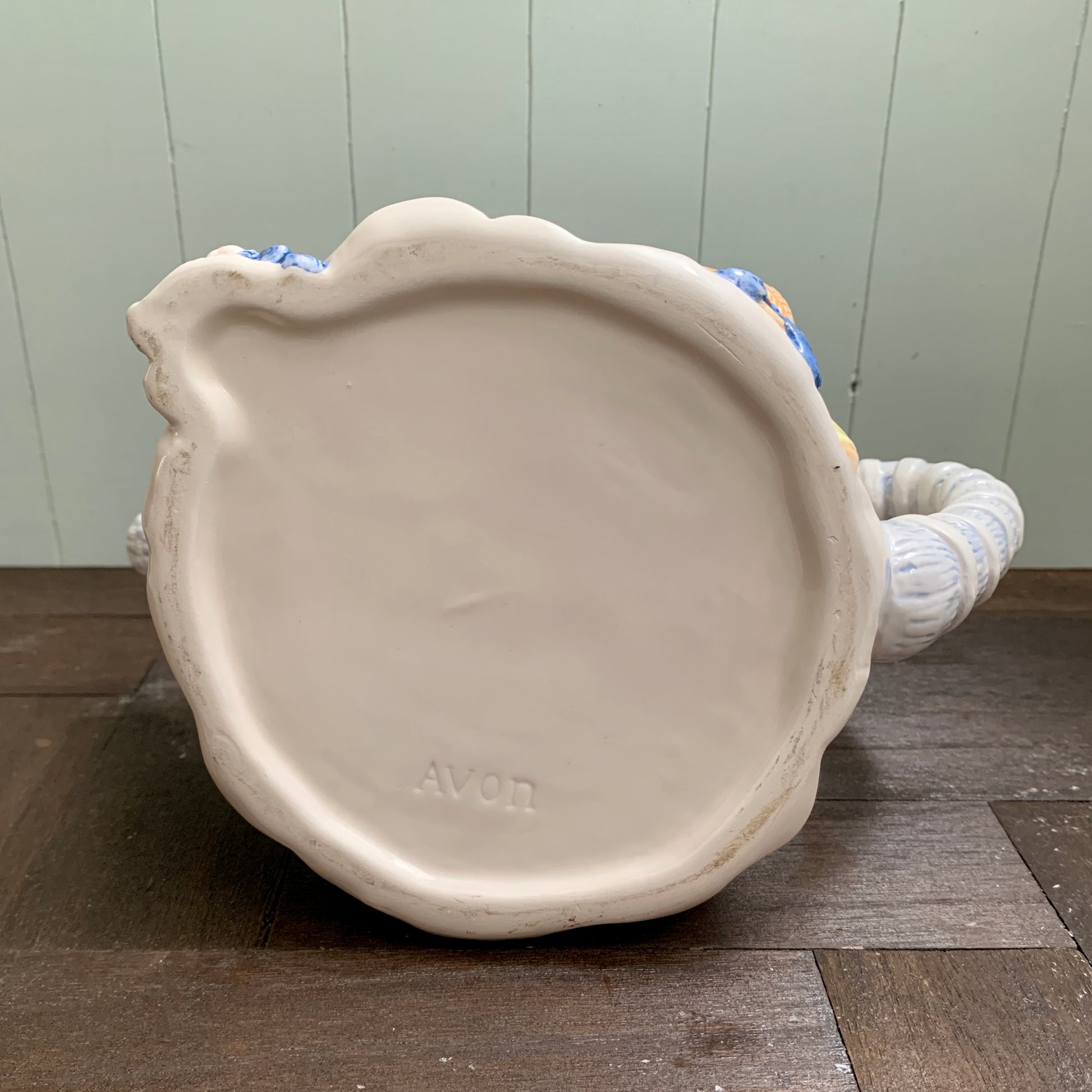 AVON社より、テーブルクロスにかくれんぼしたお茶目な猫ちゃんポットが登場です。青いバラと日傘と帽子と。これからお出かけでしょうか、穏やかな日の一コマを感じるティーポットです。