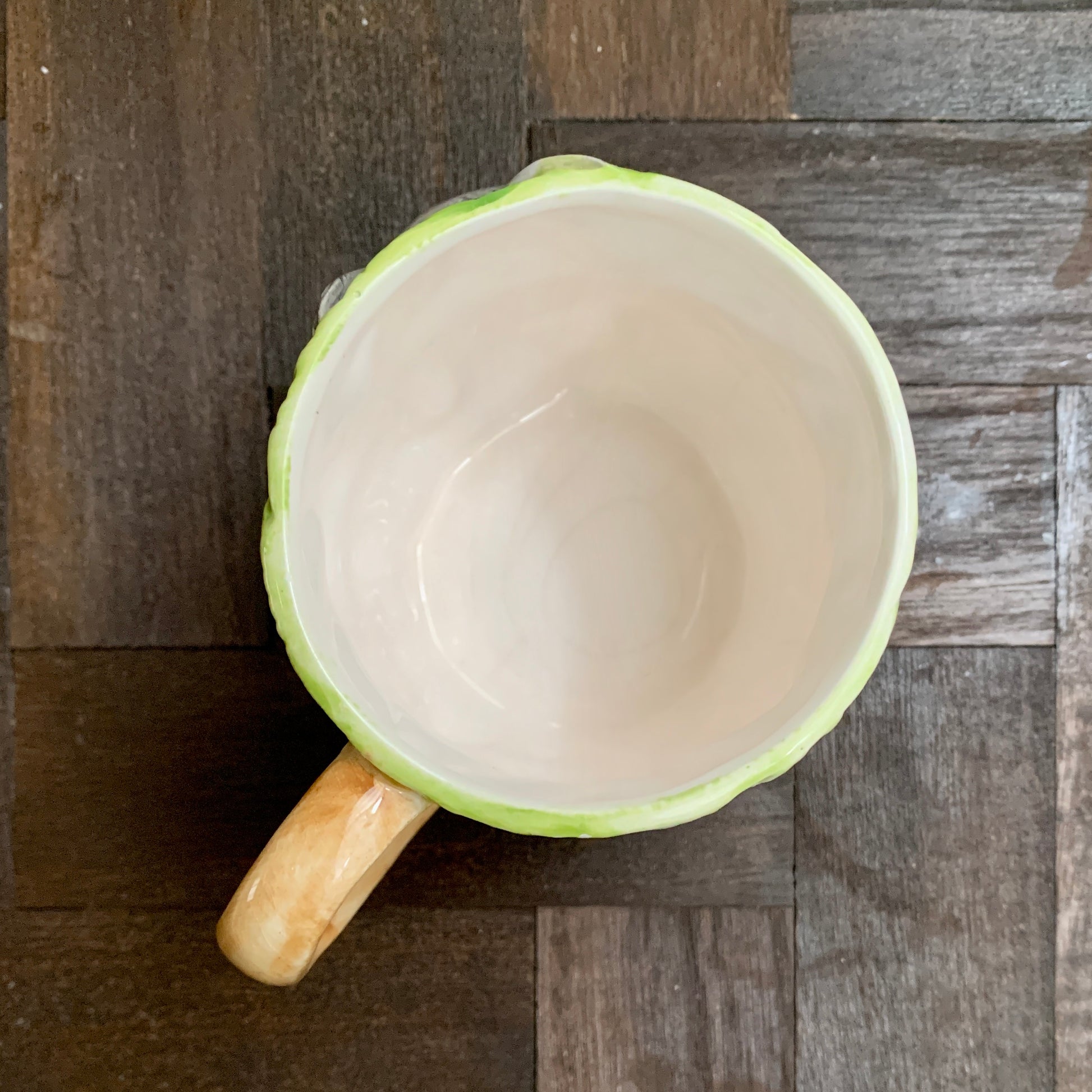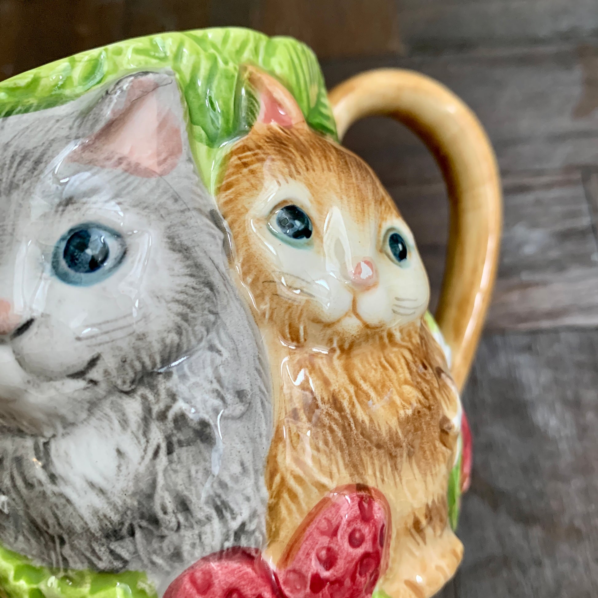 イチゴと猫が立体的なモチーフとなっており、絵付けの筆の質感もあたたかな気持ちにさせてくれるマグです。